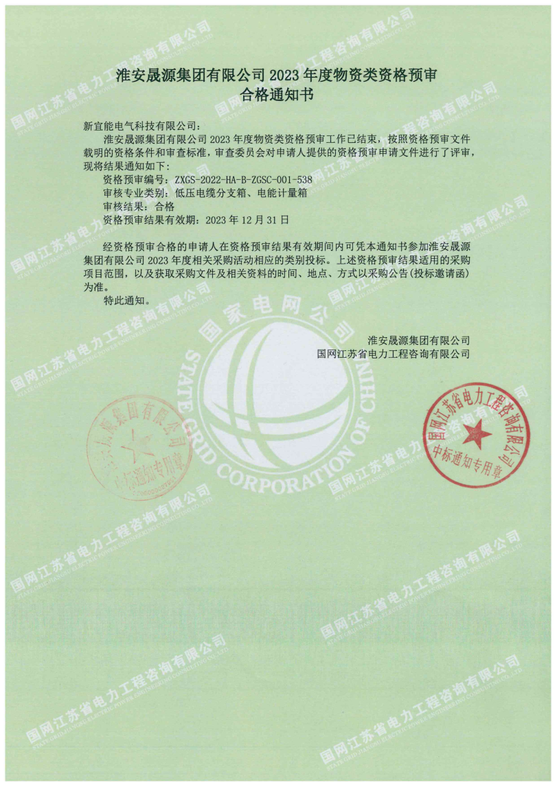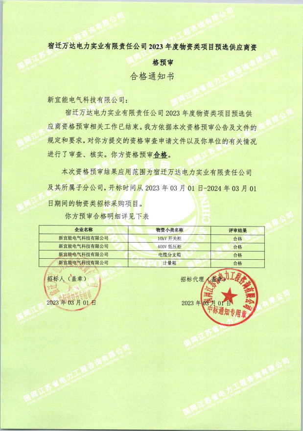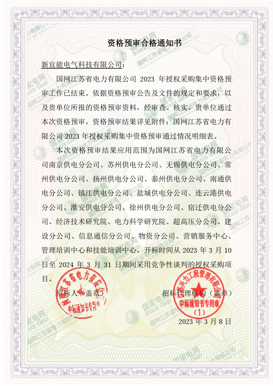 近日公司喜报频传,先后通过国网江苏省电力有限公司2023年授权采购集中资格预审、宿迁万达2023年度物资类供应商资格预审、淮安晨源集团2023年度物资类资格预审,标志着公司在市场拓展上又迈出了坚实的步伐。