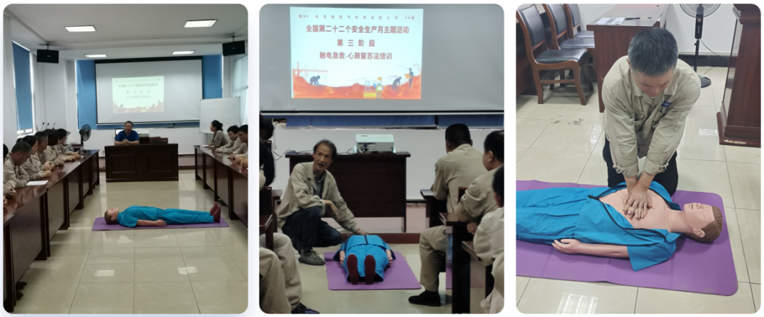 公司安全生产责任人围绕触电急救理论知识,心肺复苏、气道异物梗阻急救技能等进行了生动的讲解,并进行了现场示范演练,强调了“黄金4分钟”“救人前先评估环境、保护好自己”等核心理念。全体参培人员在安全员的指导下,逐一利用人体模型练习胸外心脏按压等技能。